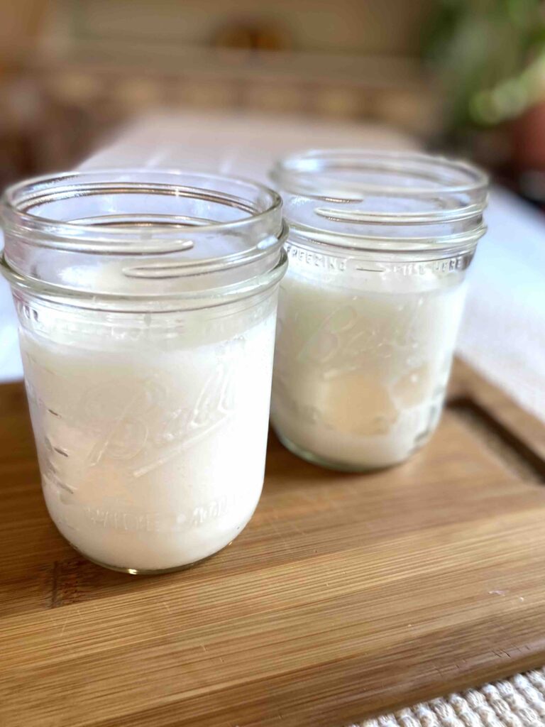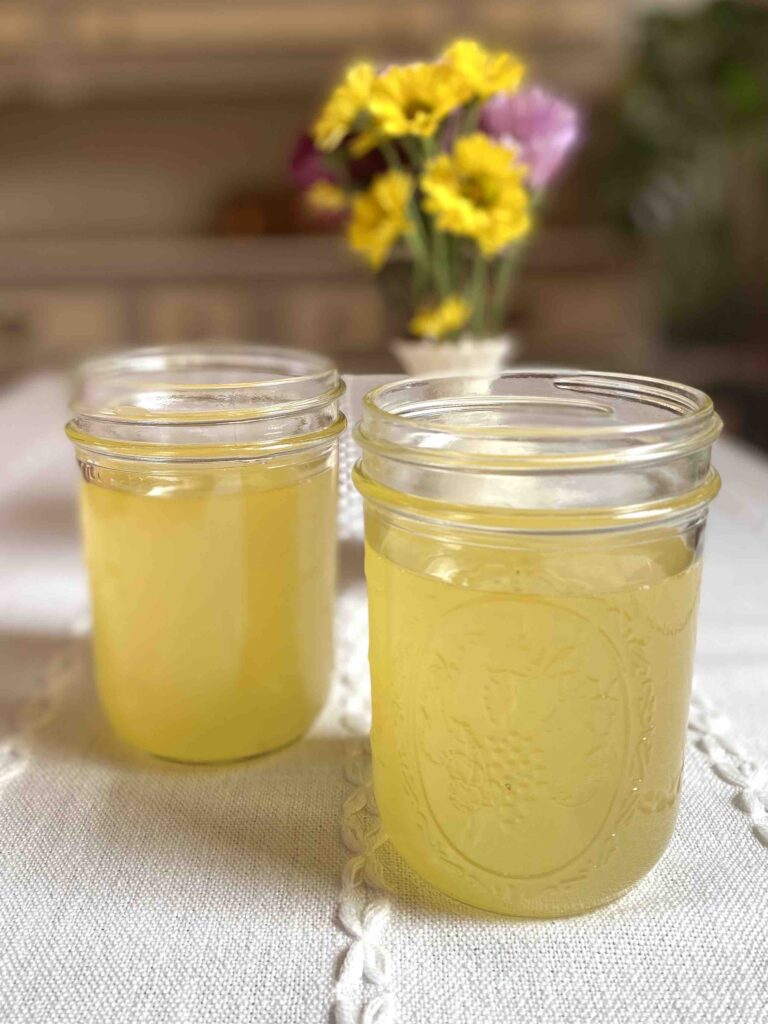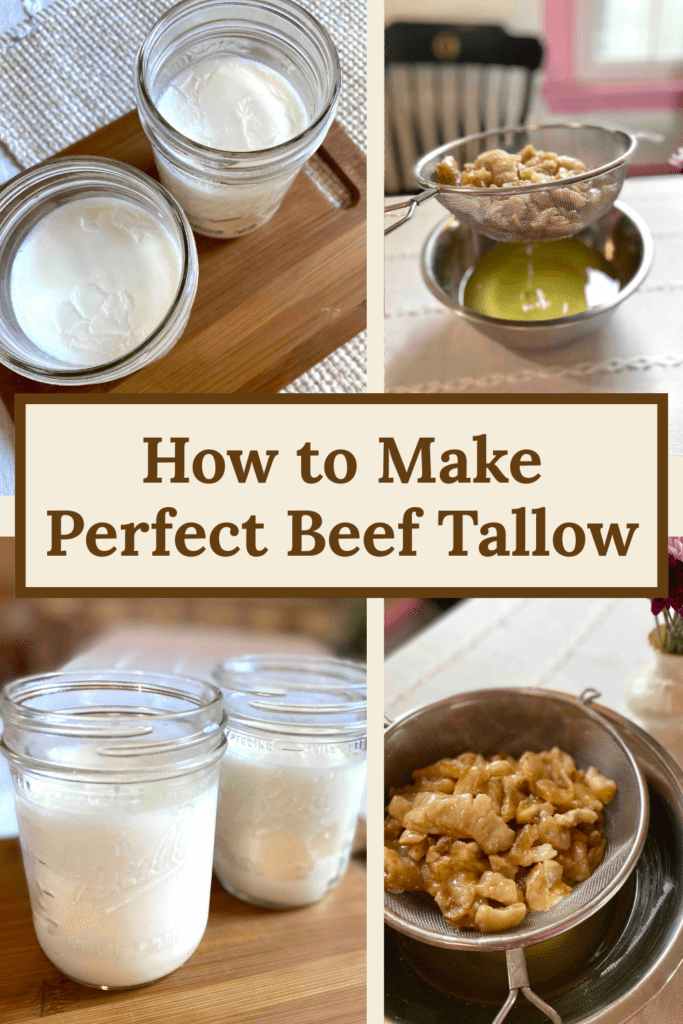 - Take out the sieve and pour the rendered beef tallow from the metal bowl into two 16 oz Mason jars.